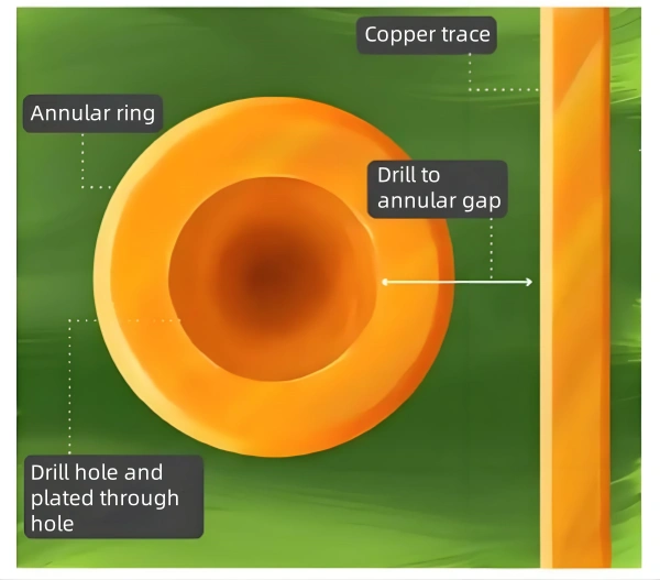 Hole rings refer to the copper surrounding a drilled hole. Due to tolerances in the manufacturing process, the remaining copper ring around a drilled hole may not perfectly align with the pad center, potentially leading to the breakage of the ring.