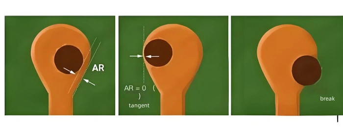 In ringed holes, tangential or breaks may occur when the drill fails to reach the desired position and deviates along the same axis. This can cause edge interconnections and affect reliability.(3) Annular Ring