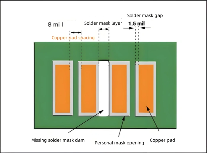 Occasionally, the solder mask may be partially or entirely absent between pads, exposing excess copper and resulting in solder bridges and short circuits that affect PCB performance.