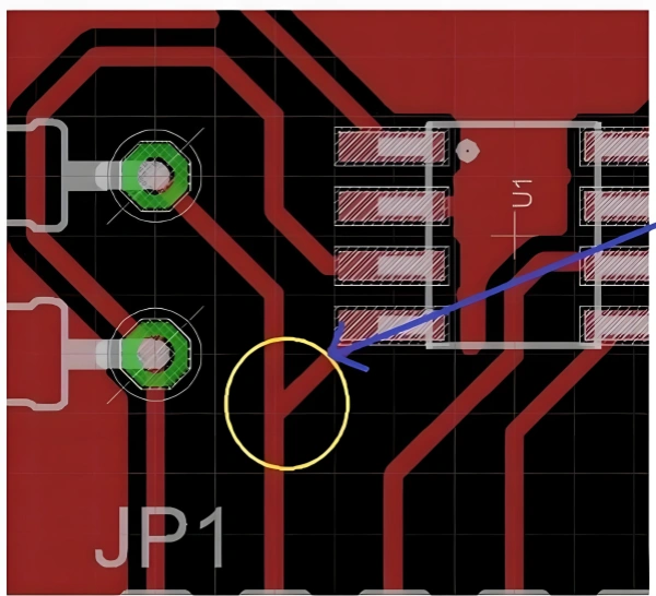 Sharp corners in routing are generally prohibited, while right angles should be avoided as much as possible in PCB routing; this has almost become a standard for measuring the quality of routing. Right-angle routing can adversely affect signal integrity, generating additional parasitic capacitance and inductance.