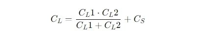 Typically, the nominal frequency provided for quartz crystal products is neither fsf_sfs nor fdf_dfd, but the frequency when a load capacitance CLC_LCL is applied. Since CLC_LCL is in parallel with C0C_0C0, the frequency is:
